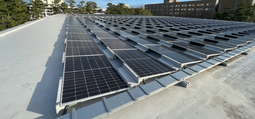 新潟大学の校舎や体育館に太陽光パネル2,028枚を設置。強風や塩害に対応した安全な設備を導入し、提案から施工・保守まで一貫して担当。